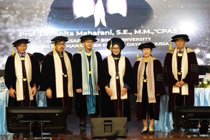 Pengukuhan Prof. Dr. Anita Maharani, S.E., M.M., CPAS. sebagai Guru Besar memperkuat komitmen BINUS University dalam mengembangkan talenta akademik yang tidak hanya berkontribusi dalam dunia pendidikan, tetapi juga memiliki dampak langsung terhadap masyarakat dan industri. Kehadiran Prof. Anita memperkaya ekosistem akademik di BINUS, menghadirkan pendekatan pembelajaran yang memadukan teori, praktik, dan nilai-nilai kemanusiaan dalam satu kesatuan.