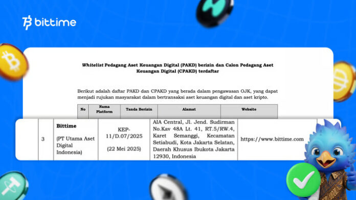 Otoritas Jasa Keuangan (OJK) resmi meluncurkan whitelist pedagang aset digital dan kripto untuk memberikan kepastian hukum bagi investor di Indonesia. Bittime, platform pertukaran aset kripto terdepan di Indonesia resmi menempati urutan ketiga pada daftar Penyelenggara Perdagangan Aset Keuangan Digital dan Aset Kripto Berizin.
