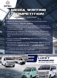 Tangerang, 21 November 2025 warnaplus.press– PT Sokonindo Automobile, sebagai perusahaan yang menaungi merek DFSK dan SERES di Indonesia, kembali hadir pada ajang Gaikindo Jakarta Auto Week (GJAW) 2025 yang berlokasi di Hall 3 – Booth 3F, Indonesia Convention Exhibition (ICE) BSD City, pada tanggal 21–30 November 2025. Dengan membawa tema “Drive Your Business”, ini menjadi komitmen DFSK untuk menjadi mitra terpercaya dalam mendukung produktivitas dan pertumbuhan dunia usaha di Indonesia.