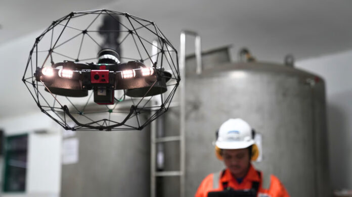 Untuk mendukung proses inspeksi yang lebih aman, Halo Robotics memanfaatkan teknologi drone confined space seperti Elios 3 sebagai alat bantu inspeksi visual. Drone ini dirancang dengan sistem navigasi yang stabil dan perlindungan fisik, sehingga dapat dioperasikan di ruang sempit dan struktur tertutup tanpa kontak langsung dengan personel.