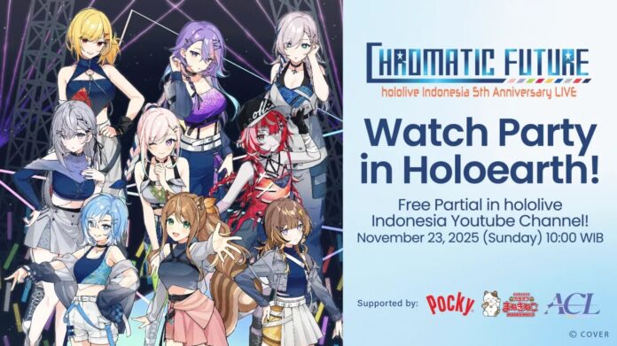 Jakarta, Indonesia – Setelah sukses mengguncang Hall 6 ICE BSD City pada hari pertama Comic Frontier 21, kini konser “hololive Indonesia 5th Anniversary LIVE – Chromatic Future” dapat dinikmati kembali oleh para penggemar melalui sebuah watch party spesial di Holoearth. Event berbayar terbatas ini bertajuk “hololive Indonesia 5th Anniversary LIVE – Chromatic Future – Watch Party in Holoearth”, dan menghadirkan penayangan ulang konser secara penuh (full concert) untuk dinikmati para fans dari berbagai penjuru dunia.