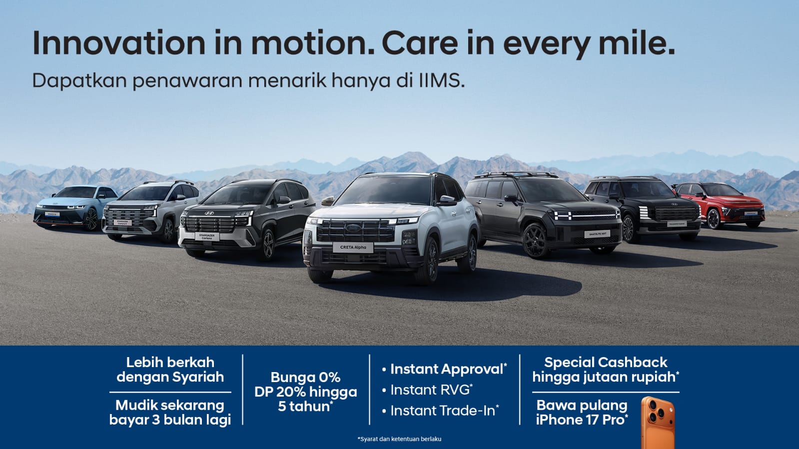 Konsumen dapat menikmati berbagai penawaran pembelian Hyundai, termasuk cicilan yang lebih ringan melalui skema pembiayaan Syariah*, bunga 0% dengan DP 20% hingga tenor 5 tahun*, serta kemudahan proses melalui Instant Approval*, Instant RVG*, dan Instant Trade-In* yang dapat dilakukan langsung di lokasi pameran. Hyundai juga menghadirkan Special Cashback hingga puluhan juta rupiah*, serta kesempatan untuk membawa pulang iPhone 17 Pro* sebagai bagian dari promo menarik yang dipadukan dengan program pembelian selama IIMS 2026.