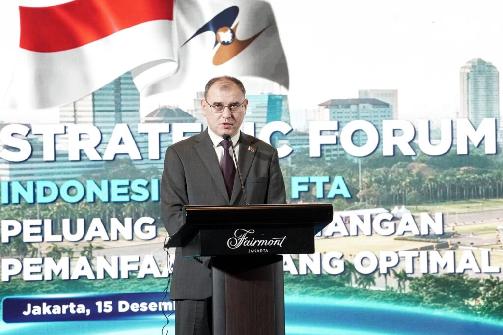 Hal ini disampaikan Mendag Busan dalam ‘Strategic Forum Perdagangan Internasional: Indonesia-EAEU FTA’ pada Senin, (15/12) di Jakarta. Turut hadir pada kegiatan ini, yaitu Wakil Perdana Menteri Belarusia Viktor Karankevich, Duta Besar Belarusia untuk Indonesia Raman Ramanouski, serta Duta Besar Armenia di Indonesia Serob Bejanyan. Sementara itu, mendampingi Mendag Busan, yaitu Wakil Menteri Perdagangan RI Dyah Roro Esti Widya Putri dan Direktur Jenderal Perundingan Perdagangan Internasional Kementerian Perdagangan RI Djatmiko Bris Witjaksono.