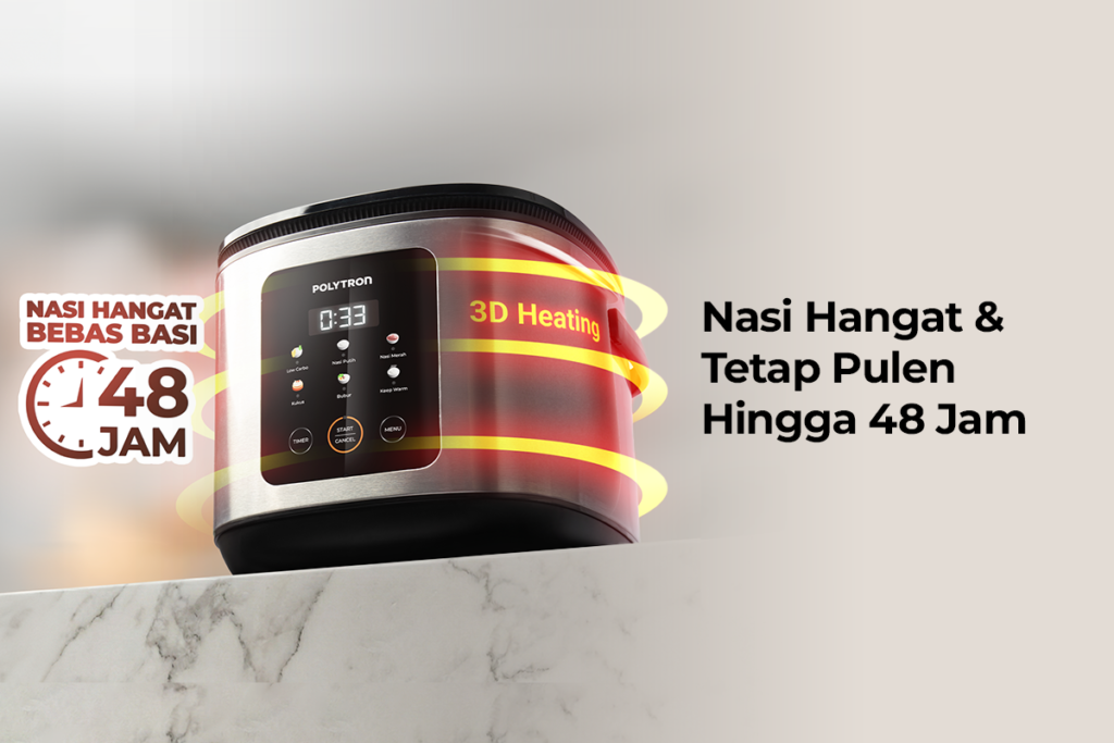 Untuk menjaga kualitas nasi tetap optimal, Polytron Kitchenmate Low Carbo dilengkapi 3D Heating Technology yang memastikan distribusi panas merata dari berbagai sisi. Teknologi ini memungkinkan nasi tetap hangat, pulen, dan tidak mudah basi hingga 48 jam, sehingga membantu mengurangi potensi pemborosan makanan di rumah.