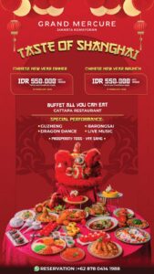 Siap menyambut Tahun Baru Cina atau yang sering disebut dengan perayaan Imlek yang bertepatan dengan Tahun Shio Kuda Api, Hotel Grand Mercure Jakarta Kemayoran menghadirkan Imlek Dinner & Brunch “All You Can Eat” yang dapat dimakan sepuasnya dengan berbagai macam pilihan sajian makanan & minuman, serta dapat menikmati sajian Barbeque, yang tak kalah spesial nan lezat dan berbagai menu signature lainnya, diantaranya Baked Whole Fish with Spicy Chili Sauce. Shabu – Shabu Station, Claypot khas Malaysian, Selection of Singapore dan berbagai menu Chinese Asian Menu serta tak