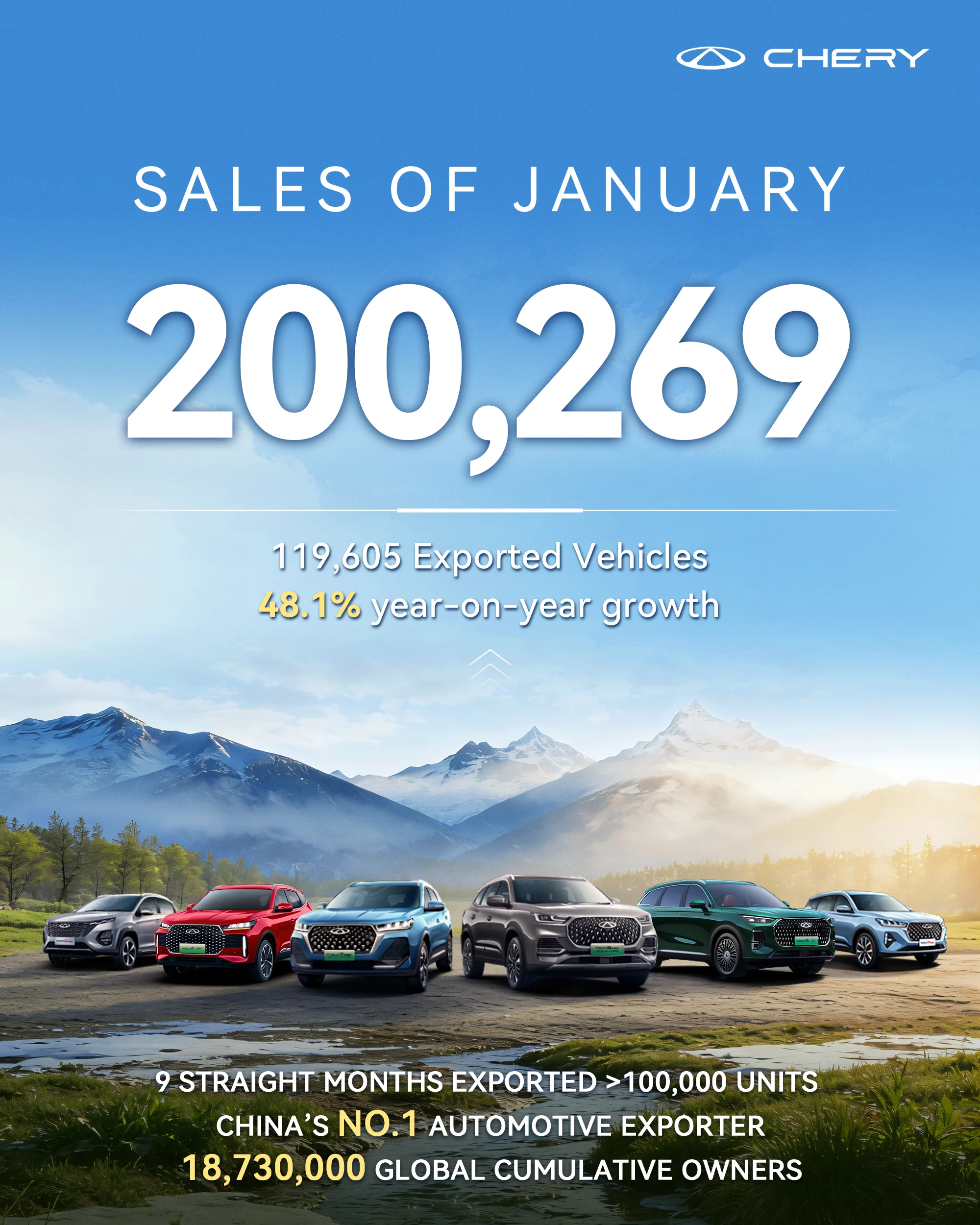 Pada Januari saja, ekspor Chery mencapai 119.605 unit, meningkat 48,1% secara tahunan (year-on-year). Pencapaian ini menandai bulan kesembilan berturut-turut dimana volume ekspor bulanan Chery melampaui angka 100.000 unit, sekaligus memperkuat posisinya sebagai salah satu merek otomotif asal Tiongkok dengan volume ekspor terbesar.